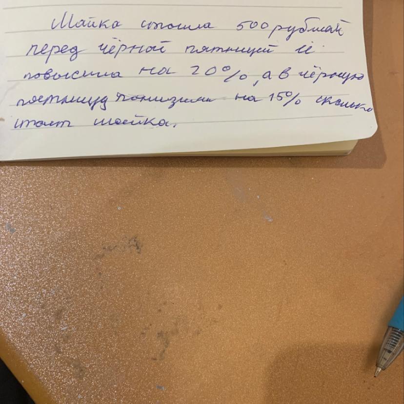 1)500/100*(100+20)=600 2)600/100*(100-15)=510