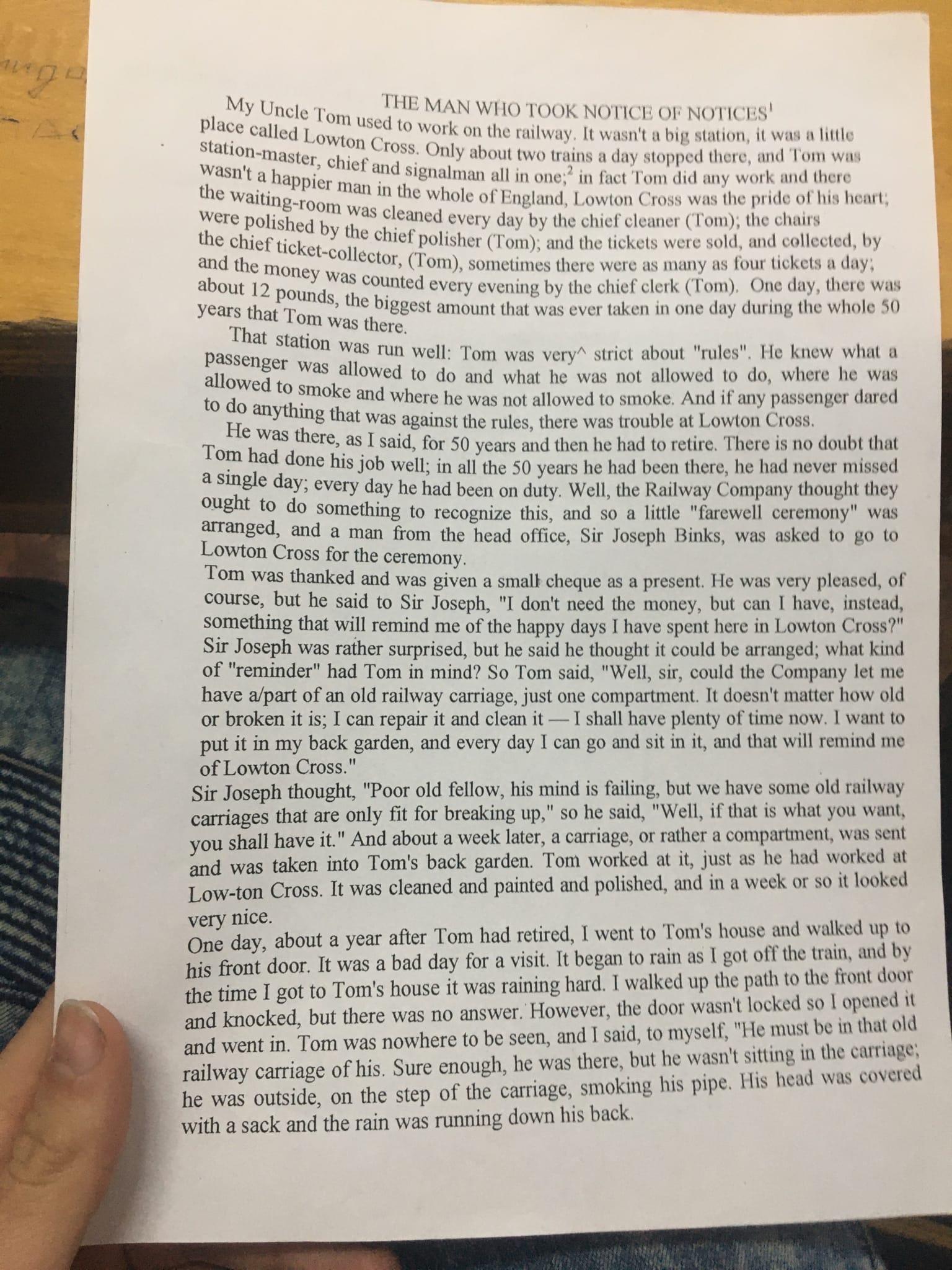 Ответ:ЧЕЛОВЕК БЫЛ ОБРАБОТАН УВЕДОМЛЕНИЕ О УВЕДОМЛЕНИЯХ Wiy Cncle Tom использовал Will on the rai wr Это было очень важно, так как там находился маленький пинц по кличке LoAon Cuss nb aheur ta raina ndn, а Тос был стат-во-мастером, начальником и сигнальщиком. Тем не менее, любая работа, и во всем Enelwd Loten Crean был гордым человеком, гордостью его был каждый день, а главный уборщик (Том) каждый день встречал его в ожидании. ichr (Билеты на Тем и Джея были проданы и собраны, по сути, сборщиком билетов (Tonuomdimes, где я видел столько же, сколько и ядовитых собак в день), и каждый из них был подсчитан на протяжении всего вечера главным клерком (Том). 12 лей, самый большой амуат, который когда-либо принимался за один день за все те 50 лет, что Тон был там. Эта сина была очень хороша: Том был очень недоволен "нулями". Он знал, что разрешено делать Пассеру и что он не было разрешено делать, где EE WES теперь курить и где он был tu, намекает на scacke. Гер осмелился сделать что-нибудь, что могло бы помешать этому, у Лоутона Красса были проблемы. Он был там, как и раньше, 50 лет, а затем ушел на пенсию. Нет сомнений в том, что Том Лад отлично справлялся со своей работой, за все те 50 лет, что он там провел, он никогда не пропускал ни одного дня; каждый день он дежурил на дежурстве. Ну, железнодорожная компания думала, что они должны сделать сонет, чтобы распознать их, и поэтому был разгромлен маленький «Carewell ceremuay», и няну из головного офиса, Sur Joseph Binks, попросили поехать в Лоутон Crosa для он cerernemy. Тому поблагодарили, а в качестве подарка дали маленький кусочек. Конечно, он был очень доволен, но он сказал сэру Джазефу: «Мне нужны деньги, но что я могу иметь вместо этого, что-то, что напомнит мне о Лаппайских днях, которые я провел здесь, это Крест Лоутана?» Сэр Jnseph был довольно удивлен, но: он сказал, что он думал, что это может быть организовано; Какое «напоминание» имел в виду Тэм? Так сказал Том. «Что ж, сэр, можно сказать, что компания дала мне часть старого железнодорожного вагона, всего лишь одно кладбище. Неважно, сколько ему лет или сломано; Я могу повторить это и очистить его - у меня будет достаточно времени, теперь я хочу положить его в свой сад, и каждый день я могу пойти и посидеть в нем, и это будет напоминать о Лоутоне Коссе. «Сэр Джозеф, «Бедный старик, его разум теряет сознание, но у нас есть несколько старых железнодорожных вагонов, которые только для того, чтобы разбить их», поэтому он сказал: «Ну, если это то, что ты хочешь, у тебя будет я». И примерно неделю спустя, осада, или, скорее, уступка, была отправлена и была доставлена в огород Тома. Том работал над этим, так же, как у него был рабочий столик в Low-ton Cress. Он был вымыт, выкрашен и отполирован, и в ужасном состоянии выглядел очень красиво. Однажды, примерно через год после ухода Тома, я пошел к дому Тома и проснулся к его входной двери. Это был плохой день для посещения. Когда я добирался до дома Тома, он начинал дуть, и к тому времени, когда я шел к дому Тома, это была дождевая рука. Я поднял патл перед входом в дверь и постучал, но ответа не было. Однако дверь не была заперта, поэтому открыли ее и вошли в Тома, нигде не было видно, и я сказал Мизелю: «Должно быть, он был в шляпе, старой железной дороге его Stre enouglh, быть там, но он не сидел в кариесе он был на улице, на ступеньке де кариага, курил свое pme. Его голова была покрыта мешком, а дождь был безумным.
