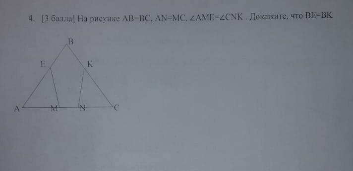 Как уже упоминалось выше, согласно условию задачи AB=BC=z. Из пункта 4 AE=CK=n. Тогда BE=z-n и BK=z-n, т.е. BE=BK.