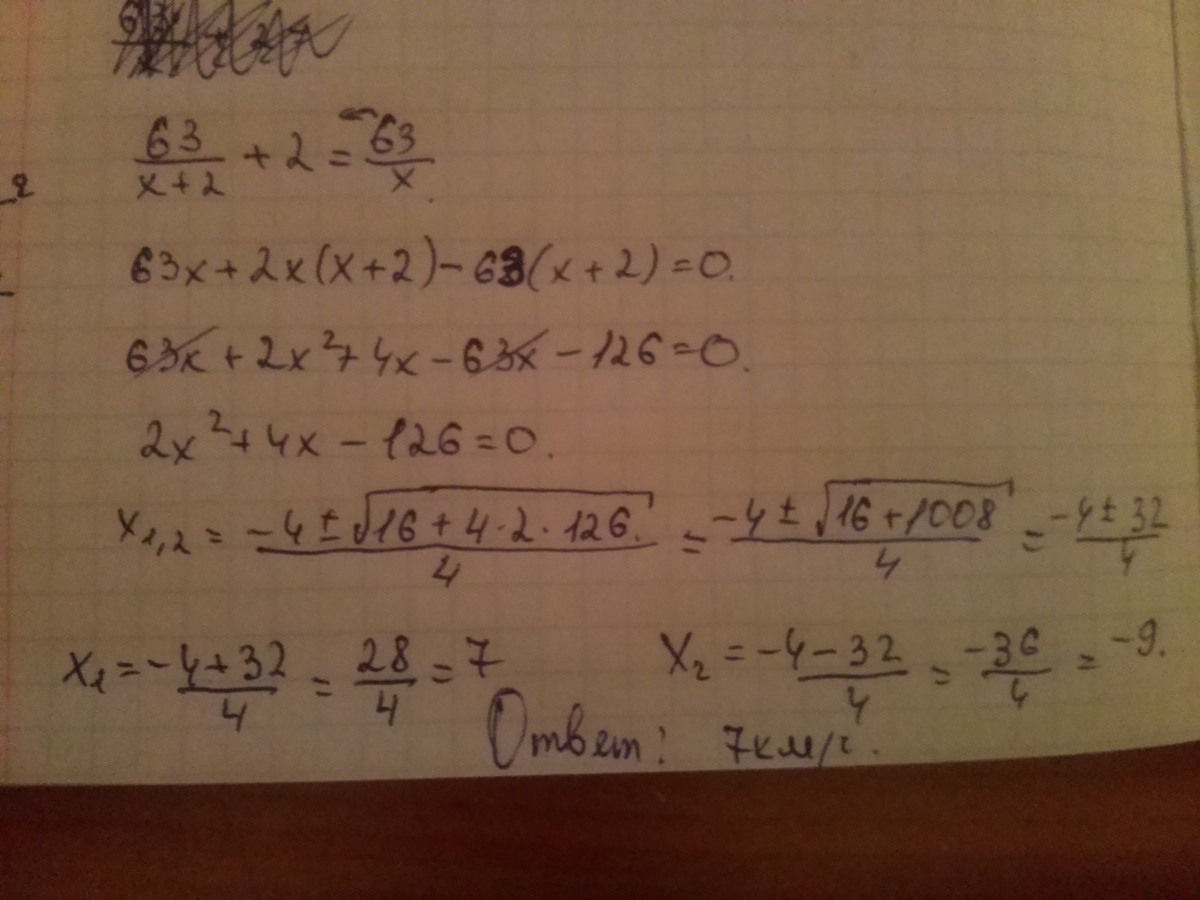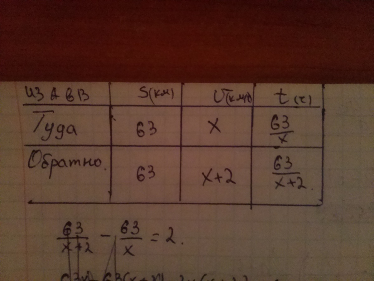 Велосипедист выехал с постоянной скоростью из города А в город В, расстояние между которыми равно 63 км. На следующий день он отправился обратно со скоростью на 2 км/ч больше прежней. По дороге он сделал остановку на 2 часа. В результате он затратил на обратный путь столько же времени, сколько на путь из А в В. Найдите скорость велосипедиста на пути из А в В. Ответ дайте в км/ч.