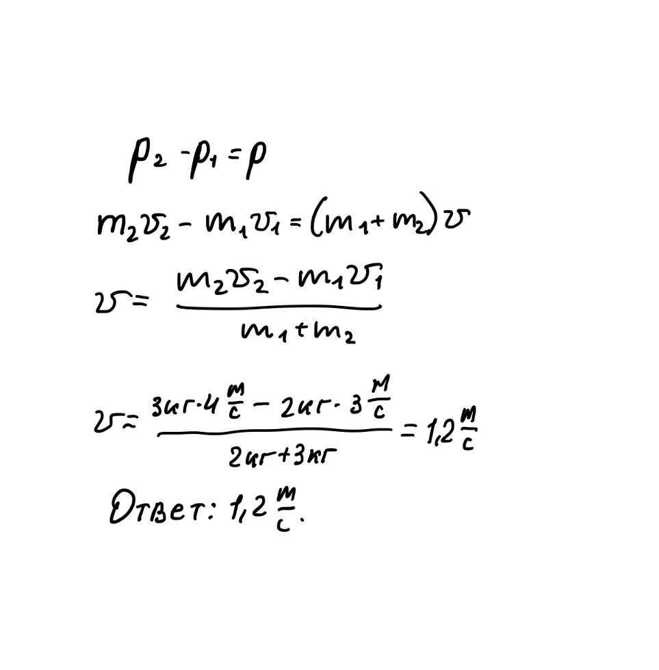 два тела массы которых 2 кг и 3 кг движутся навстречу друг другу со скоростями 3м\с и 4 м\с соответственно после столкновения они движутся как одно целое с некоторой скоростью. Определите скорость