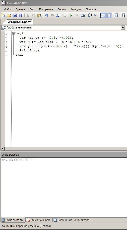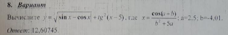 var y := Sqrt(Abs(Sin(x) - Cos(x)))+Sqr(Tan(x - 5));