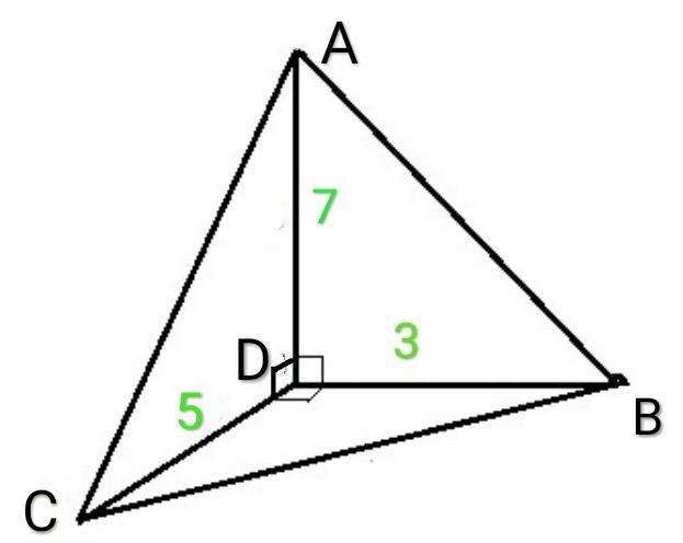 1. Рассмотрим данную пирамиду DABC, считая её основанием грань СDB, являющуюся прямоугольным треугольником, тогда ребро АD становится высотой пирамиды. (Действительно, AD⟂DB и AD⟂DС по условию, тогда по признаку перпендикулярности прямой и плоскости AD⟂(DBС).)