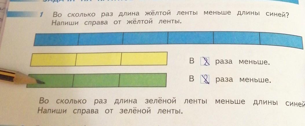 Во сколько раз длина желтой ленты меньше длины синей напиши справа от желтой ленты?