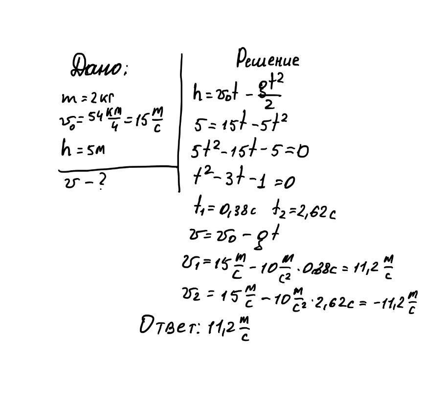 Тело массой 2 кг брошено вертикально вверх со скоростью 54км/ч. Определите его скорость на высоте 5 м. Сопротивлением воздуха пренебречь