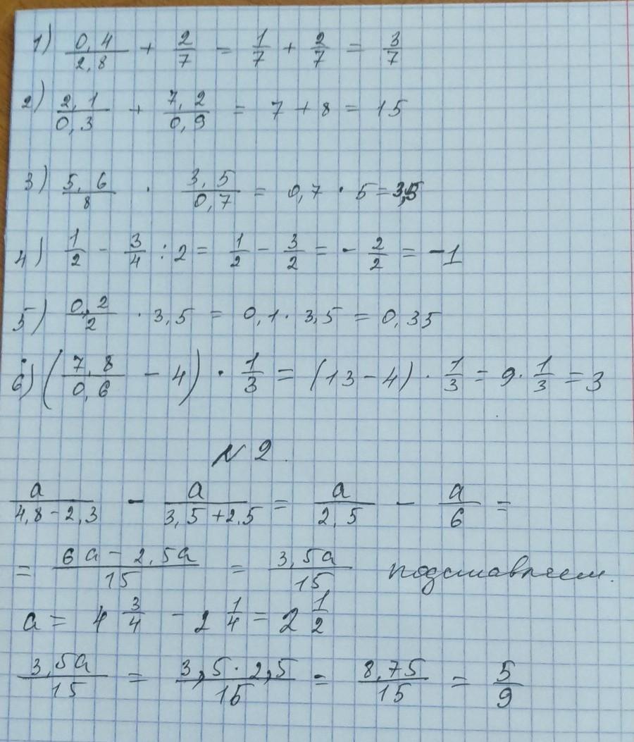 1) 0,4/2,8+2/7= 4/10 : 2 8/10 + 2/7 = 4/10 : 28/10 +2/7 = 4/10*10/28 + 2/7= 4/28+2/7= 4+8 / 28 = 12/28 = 3/ 7