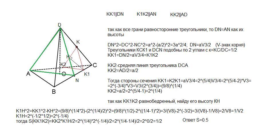 15 б Все ребра треугольной пирамидыDABC равны a .Через точку K - середину ребра DC - проведена плоскость, параллельная плоскости DNA , Где точка N - середина ребра CB. Найдите площадь полученного сечения. В ответ запишите значение площади, если a=2 корень в степени (4) из 2