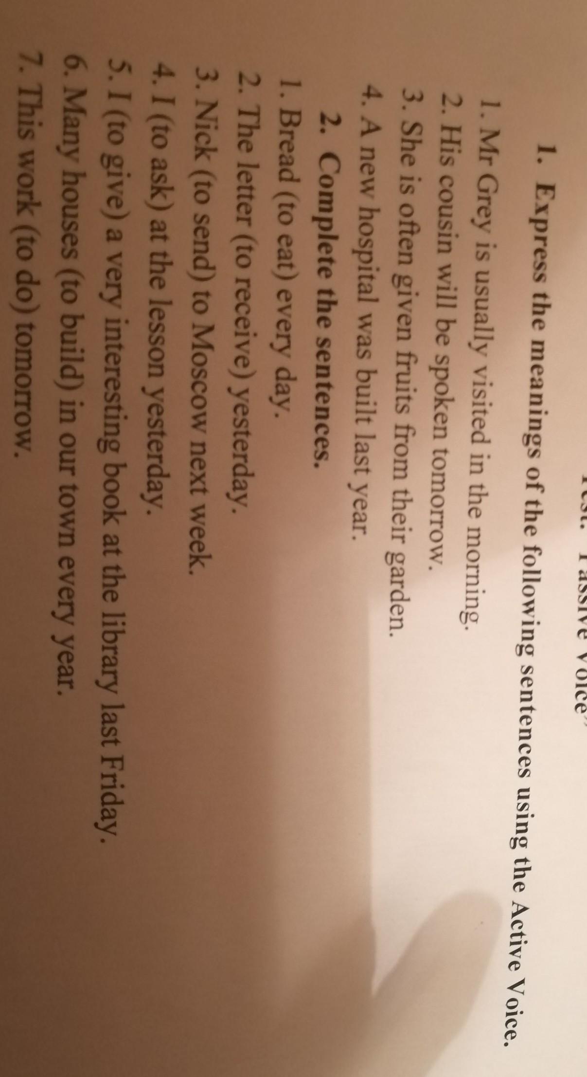 1.Мистер Грей обычно посещается утром. 2.Его кузин будет говорить завтра. 3.Она обычно отдаёт фрукты из её сада. 4.Новая больница была построена в прошлом году.