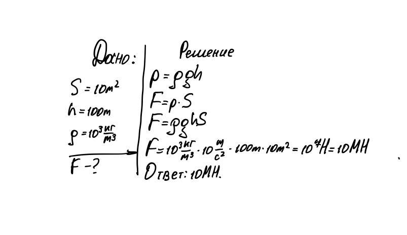 F=PS=ρghS=1000кг/м³ * 10м/c² * 100м *10м²=10000000 кг*м/c²=10⁷H=10⁴KH