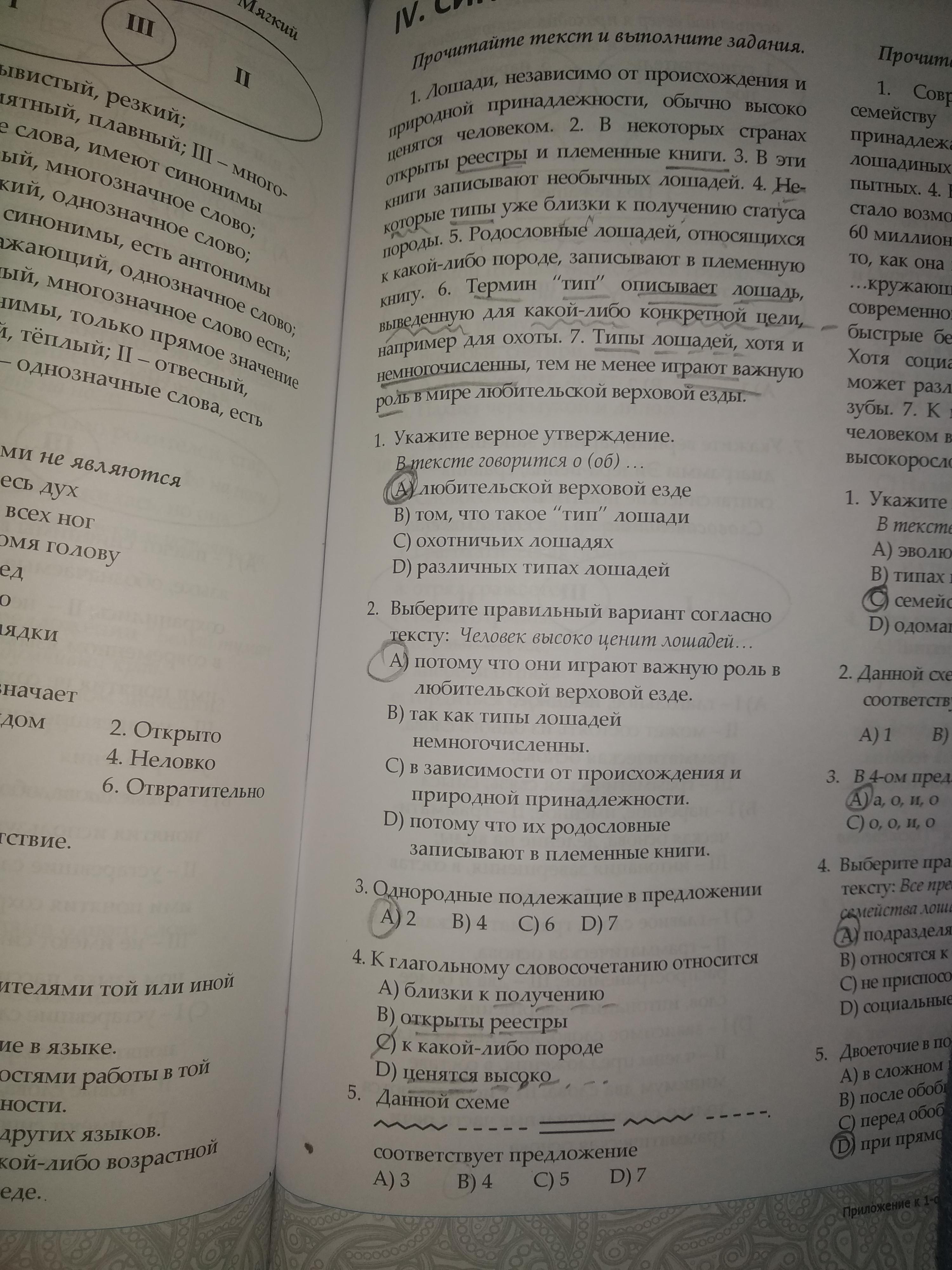 Если тебе нужны именно ответы, то вот: этот текст говорит о том что такое тип лошаде(В), тебе ведь не рассказывают как кататься. Во втором я считаю, что С, но я уверен что не А, тк не из-за это их ценят. В 3 задании все правильно. А в 4 буква D. Ценятся как? высоко ценятся глагол высоко наречие. Удачи