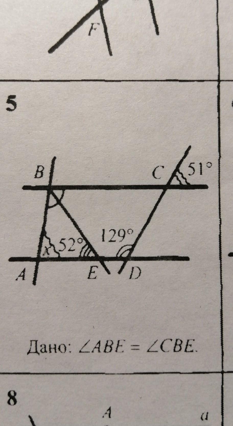 Углы при основании трапеции равны, значит угол СВЕ тоже равен 51. А дальше, как написано выше, из треугольника находится угол. Х=180-51-52=77