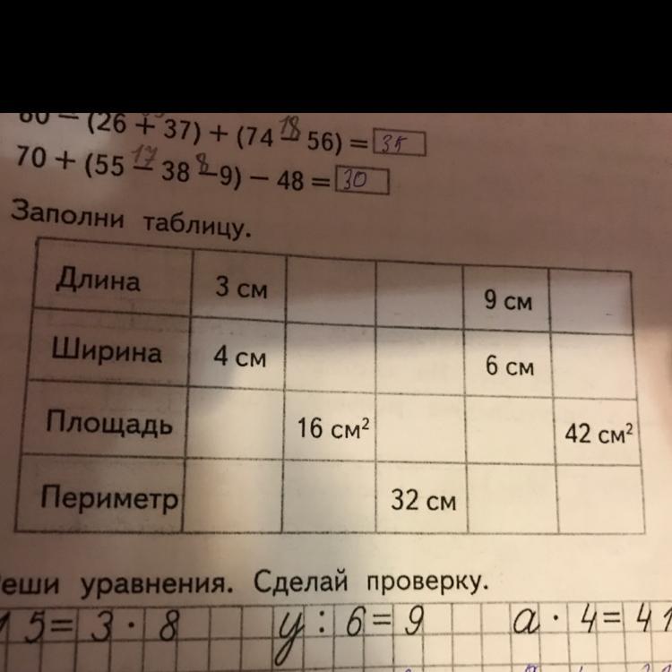 Ответ:первый столбец: площадь 12см в квадрате периметр 14см