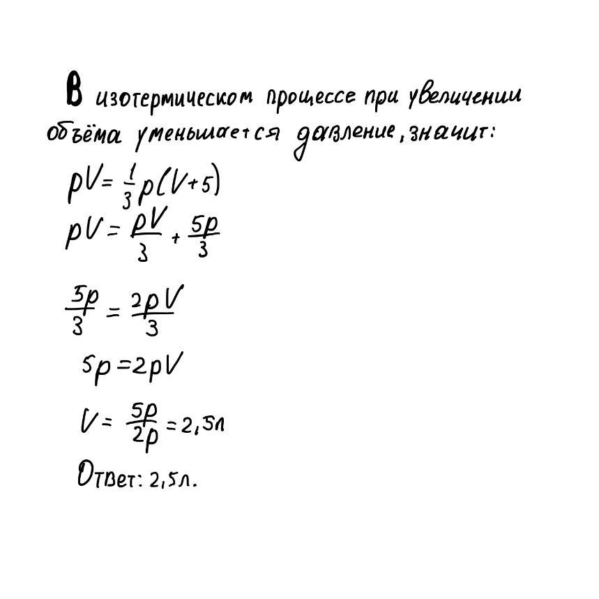 В процессе изотермического расширения давление газа изменилось в 3 раза, а его объём увеличился на 5 л. Определите начальный объём газа
