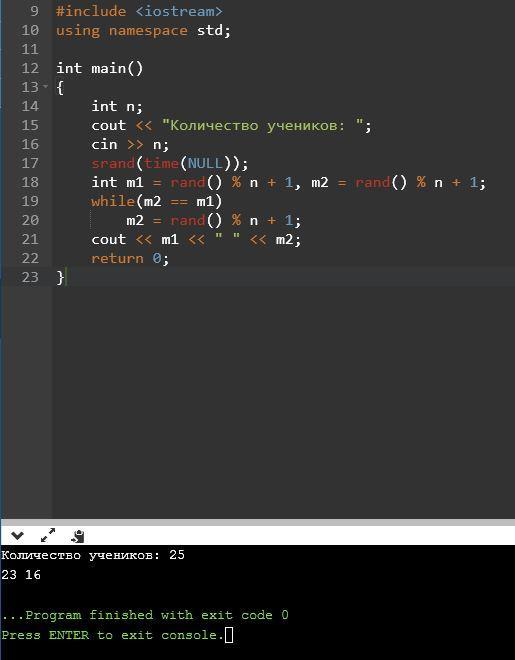 Напишите программу, которая случайным образом выбирает дежурных: выводит два случайных числа на отрезке [1; N], где N – количество учеников вашего класса. Какая проблема может при этом возникнуть? c++