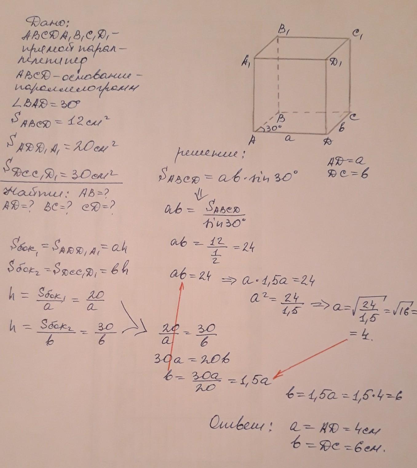 Основою прямого паралелепіпеда є паралелограм з гострим кутом 30 градусів і площею 12 см^2. Площі бічних граней паралелепіпеда дорівнюють 20см^2 і 30см^2