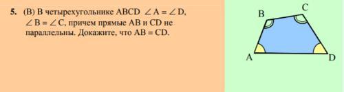 CPOЧНО!!!!!! ДАЮ 50 БАЛЛОВ!!!!!!в четырехугольнике abcd угол a= углу d. угол b=углу c причем прямые ab и cd не параллельны. докажите что ab= cd