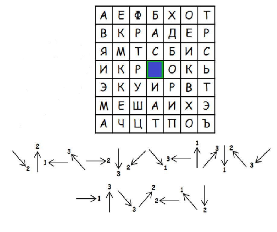 Двигаясь по стрелкам с цифрами (цифры обозначают номер клетки по указанному направлению), начиная каждый раз от центра, прочти словосочетание.