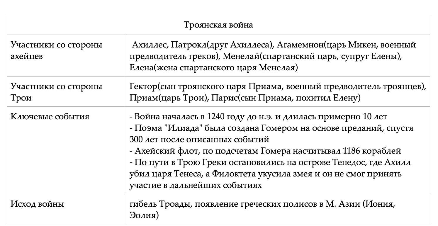 Таблицу об основной информации о Троянской войне можно заполнить так: