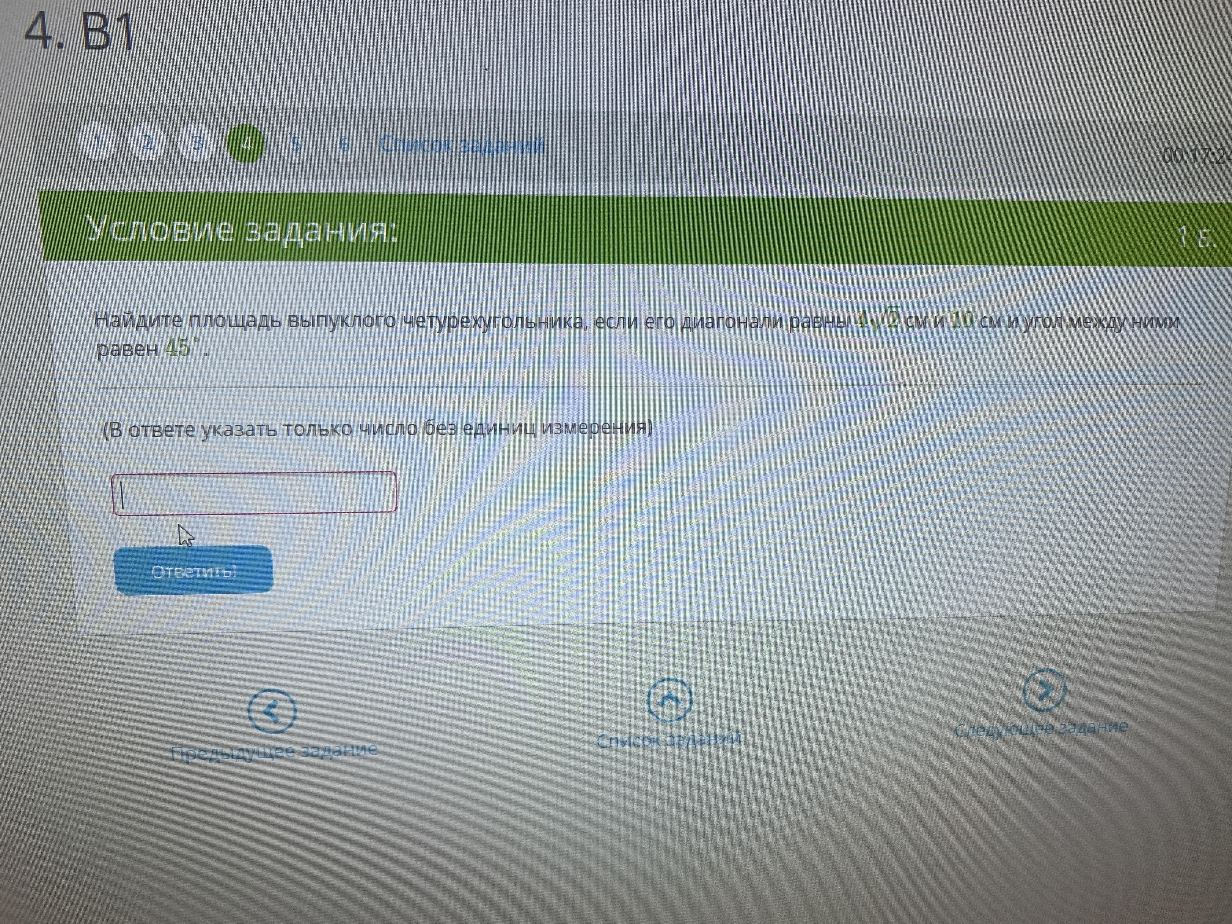 S= 1/2 *d1 *d2 *sinф =1/2 *4V2 *10 *V2/2 =20 (см^2)
