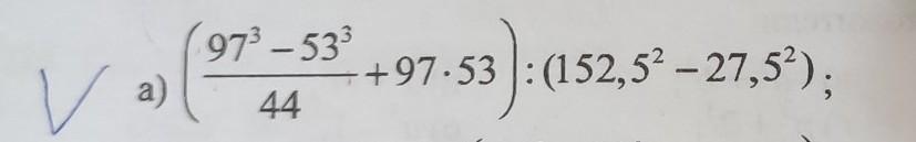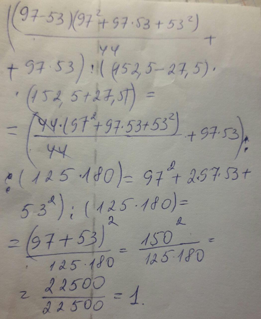 97x97x97 = 912673. 912673 - 53x53x53 = 912673 - 148877. 912673 - 148877 = 763796. 763796 : 44 = 17359. 17359 + 97x53 = 17359 + 5141. 17359 + 5141 = 22500. 22500 : (152,5x152,5 - 27,5x27,5). 152,5x152,5 = 23256,25. 23256,25 - 27,5x27,5. 23256,25 - 756,25 = 22500. 22500 : 22500 = 1