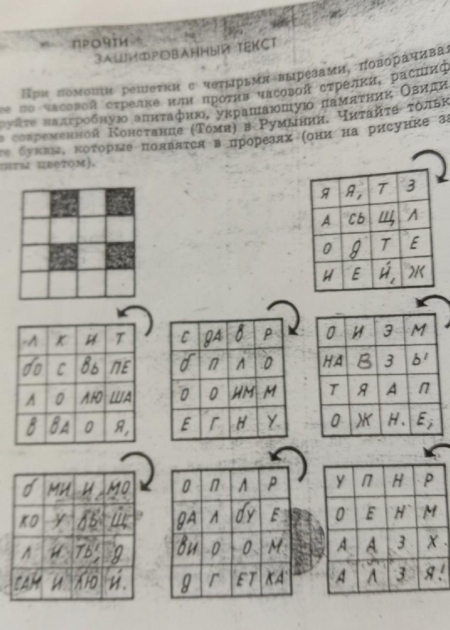прочти зашифрованный текст При помощи решетки с четырьмя вырезами, поворачивая по часовой стрелке или против часовой стрелки, расшиф- руйте надгробную эпитафию, украшающую памятник Овидия современной Констанце (Тома) в Румынии. Читайте только те буквы, которые появятся в прорезях (они на рисунке за ветом).