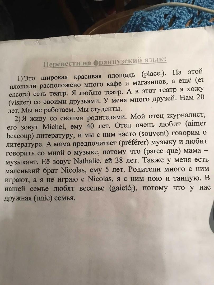 1) C'est une belle région large (placep). Il y a de nombreux cafés et magasins sur cette place, et il y a aussi un théâtre (et encore). J'adore le théâtre. Et je vais à ce théâtre (Visiter) avec mes amis. J'ai beaucoup d'amis. Nous avons 20 ans. Nous ne travaillons pas. Nous sommes étudiants. 2) Je vis avec mes parents. Mon père est journaliste, il s'appelle Michel, il a 40 ans. Père très amoureux de la littérature (aimer beacoup), et nous parlons souvent (souvent) de littérature. Et ma mère préfère (de préférence) la musique et aime me parler de la musique, parce que (parce que) maman est musicienne. Son nom est Nathalie, elle a 38 ans. J'ai aussi un petit frère Nicolas, qui a 5 ans. Les parents jouent beaucoup avec lui, mais je ne joue pas avec Nicolas, je chante et danse avec lui. Notre famille aime s'amuser (gaiete?), Parce que nous avons une famille sympathique (unie).