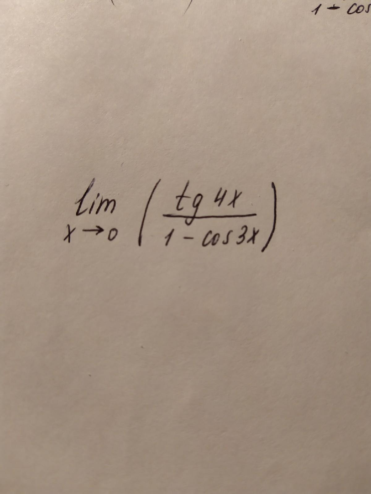 \lim\limits _{x \to 0}\frac{tg4x}{1-cos3x}=\lim\limits _{x \to 0}\frac{tg4x}{2sin^2\frac{3x}{2}}=\Big [\; tg4x\sim 4x\; ,\; \; sin\frac{3x}{2}\sim \frac{3x}{2}\; \; pri\; \; \; x\to 0\; \Big ]=\\\\\\=\lim\limits _{x \to 0}\frac{4x}{2\cdot \frac{9x^2}{4}}=\lim\limits _{x \to 0}\frac{8}{9x}=\infty