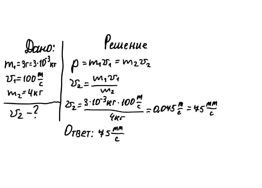 скорость пули при выстреле из ружья 100м/с ,а ее масса 3 г . определить скорость отдачи ружья при выстреле ,если его масса 4 кг