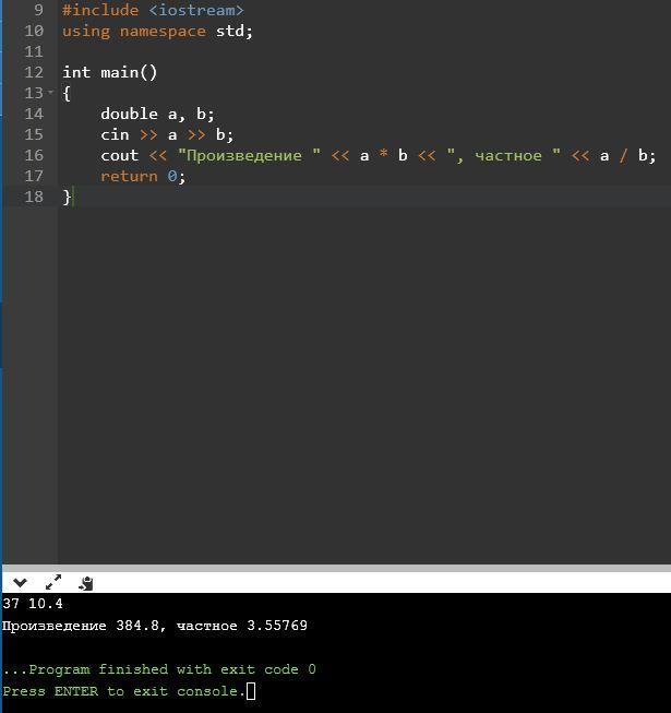 cout << "Произведение " << a * b << ", частное " << a / b;