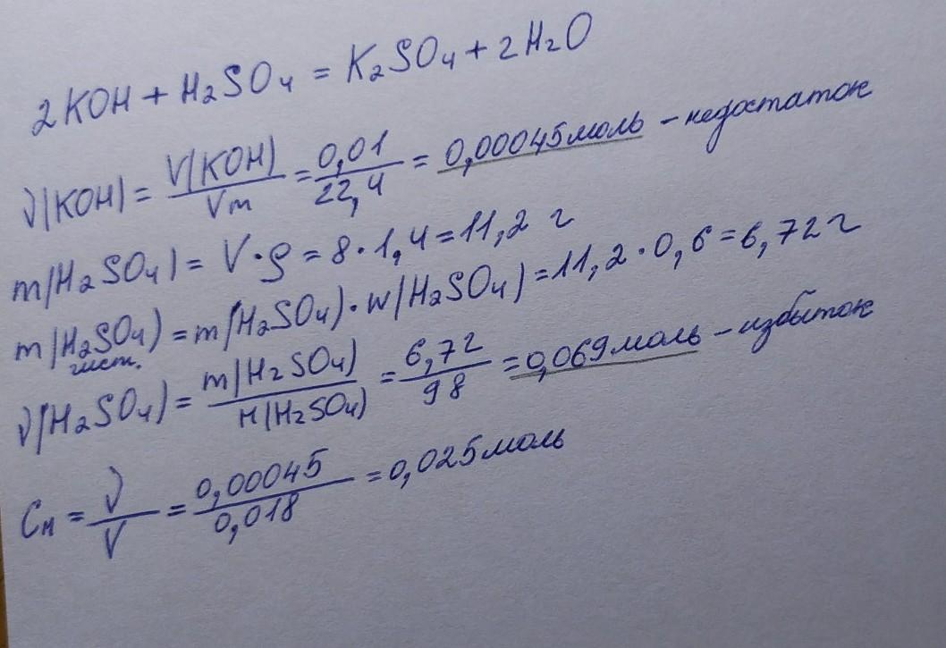 чему равна молярная концентрация раствора KOH,если на нейтрализацию 10 мл его идет 8 мл раствора H2SO4 с массовой долей 60%(р=1,4г/мл)