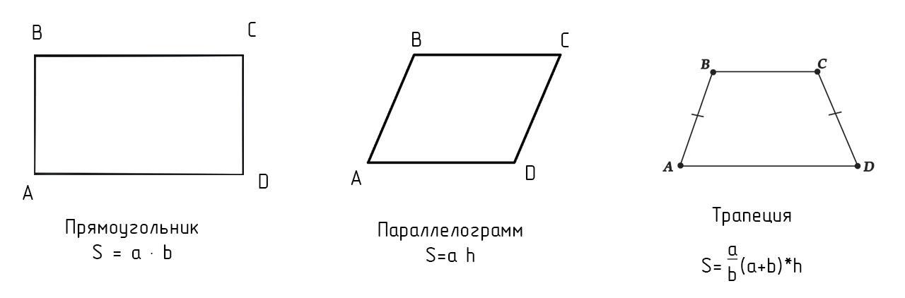 начерти прямоугольник, параллелограмм и трапецию, обозначь их заглавными буквами и запиши формулу для S каждой фигуры