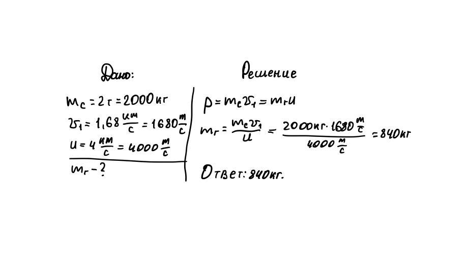 С поверхности Луны стартовала ракета массой mс = 2т. Спустя время т ракета достигла первой (лунной) космической скорости v1 = 1,68 км/с. Определить массовый расход ц топлива, если скорость u истечения газов из сопла ракеты равна 4 км/с. Силой тяжести пренебречь