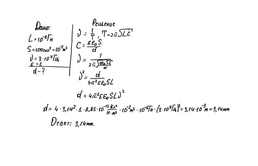 Коливальний контур скл. з котушки індуктивністю 10^-6 Гн. і повітряного конденсатора з площею пластин 100см^2. На якій відстані знаходяться пастини,якщо контур резонує на частоті 3*10^7 Гц???