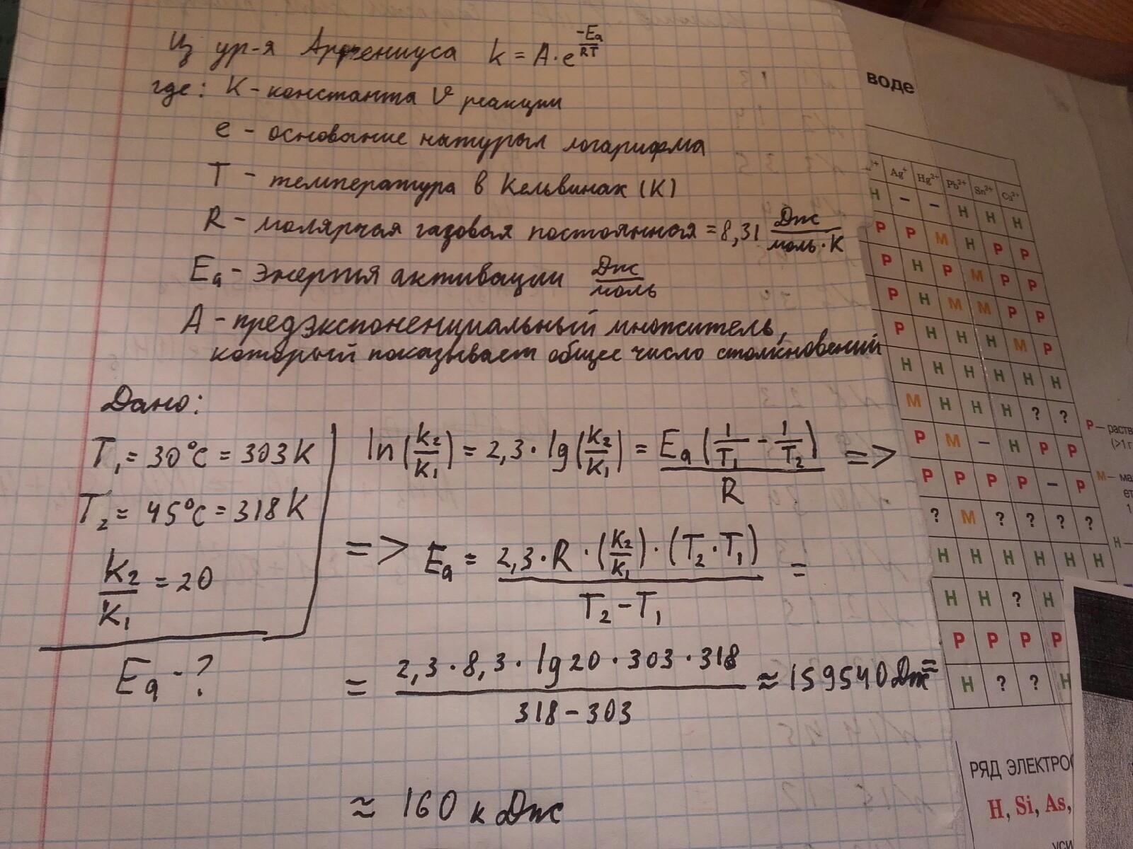 Еа=[(8.31*303.15*318.15)/(318.15-303.15)]*ln20=160067.17 Дж/моль или примерно 160кДж/моль