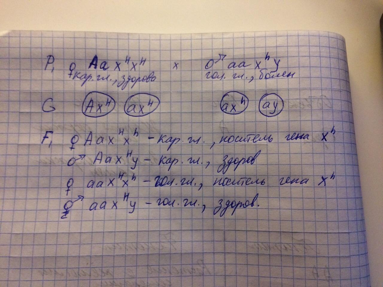 Гетерозиготная кареглазая брюнетка, все родственники которой здоровы, выходит замуж за голубоглазого блондина, страдающего гемофилией. Какие признаки унаследуют их дети?