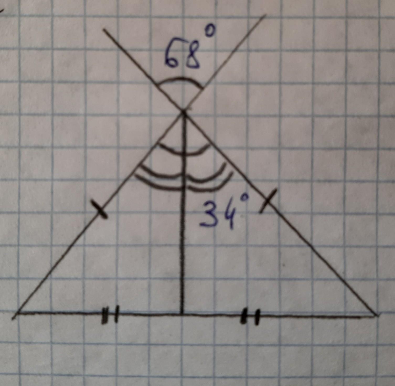 угол,вертикальный углу при вершине равнобедренного треугольника,равен 68°.Найдите угол между боковой стороной треугольника и медианой,проведенной к основанию