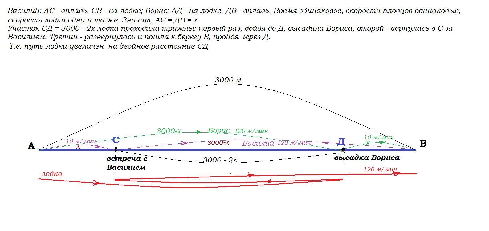 (3000 - 2Х) м ---- расстояние между местом высадки Бориса и местом, где лодка подобрала Василия.