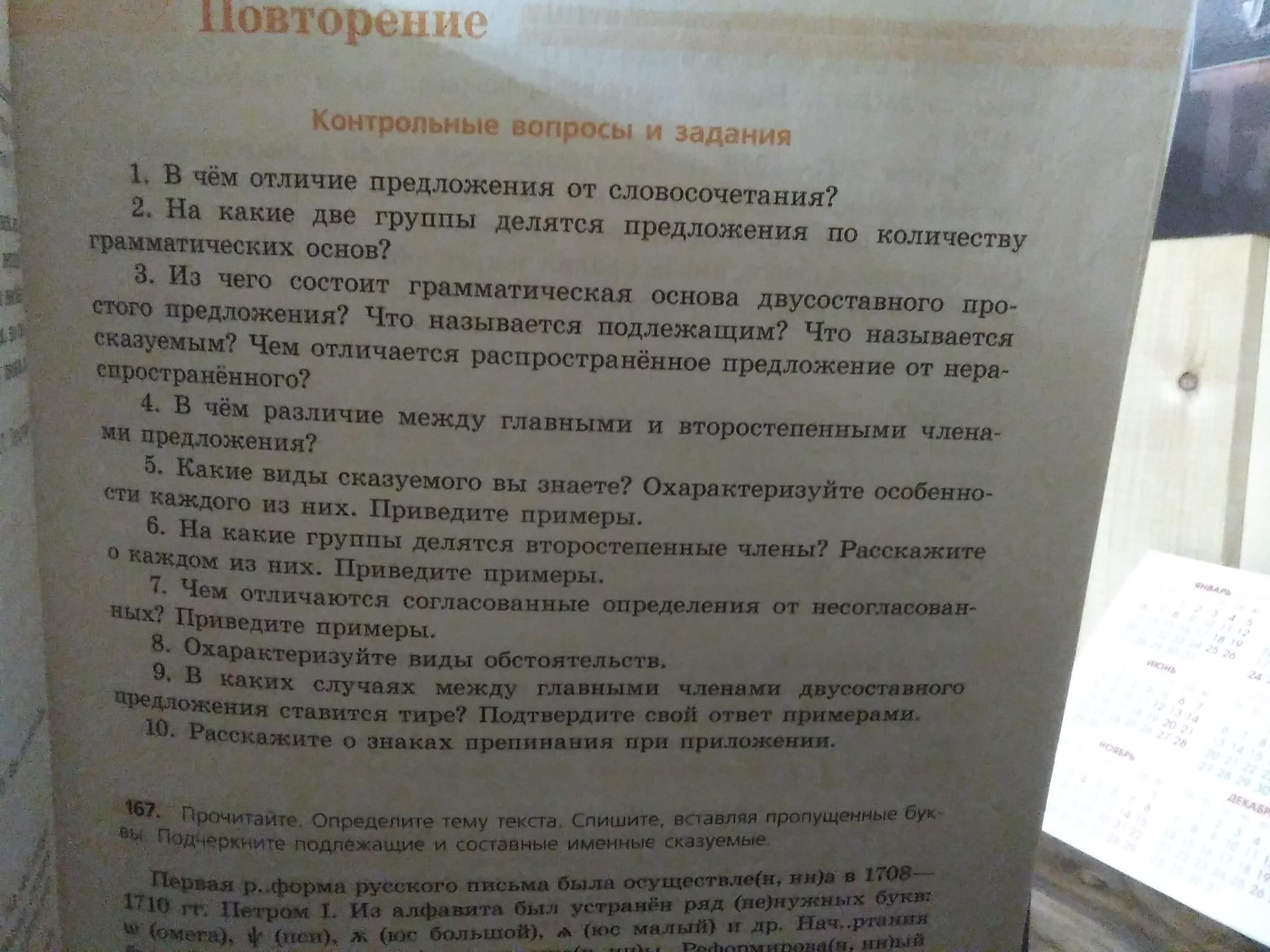3) Двусоставное предложение состоит из двух главных членов подлежащего и сказуемого. Сказуемое называется глагол, который обозначает действие или состояние предметов, лиц, которыми выражено подлежащие. Распространенное предложение - это предложение, в котором кроме главных членов есть и второстепенные члены предложения. Пример: Весь день дует ветер. Нераспространенное предложение - это предложение, в котором нет второстепенных членов. Пример: Ветер дует.