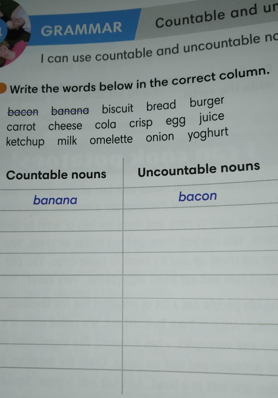 Uncountable nouns: bread, cheese, cola, juice, ketchup, milk, yogurt.