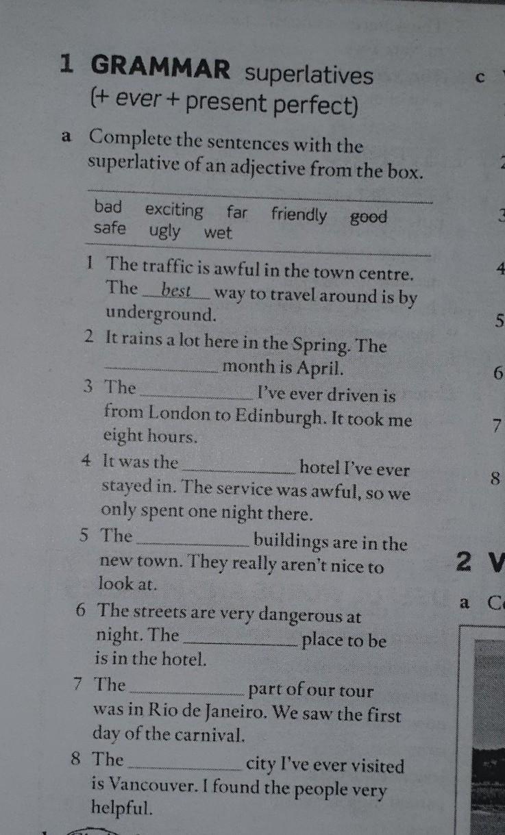 2.the wettest 3.the furthest 4.the worst 5.the ugliest 6.the safest 7.the most exciting 8.the friendliest