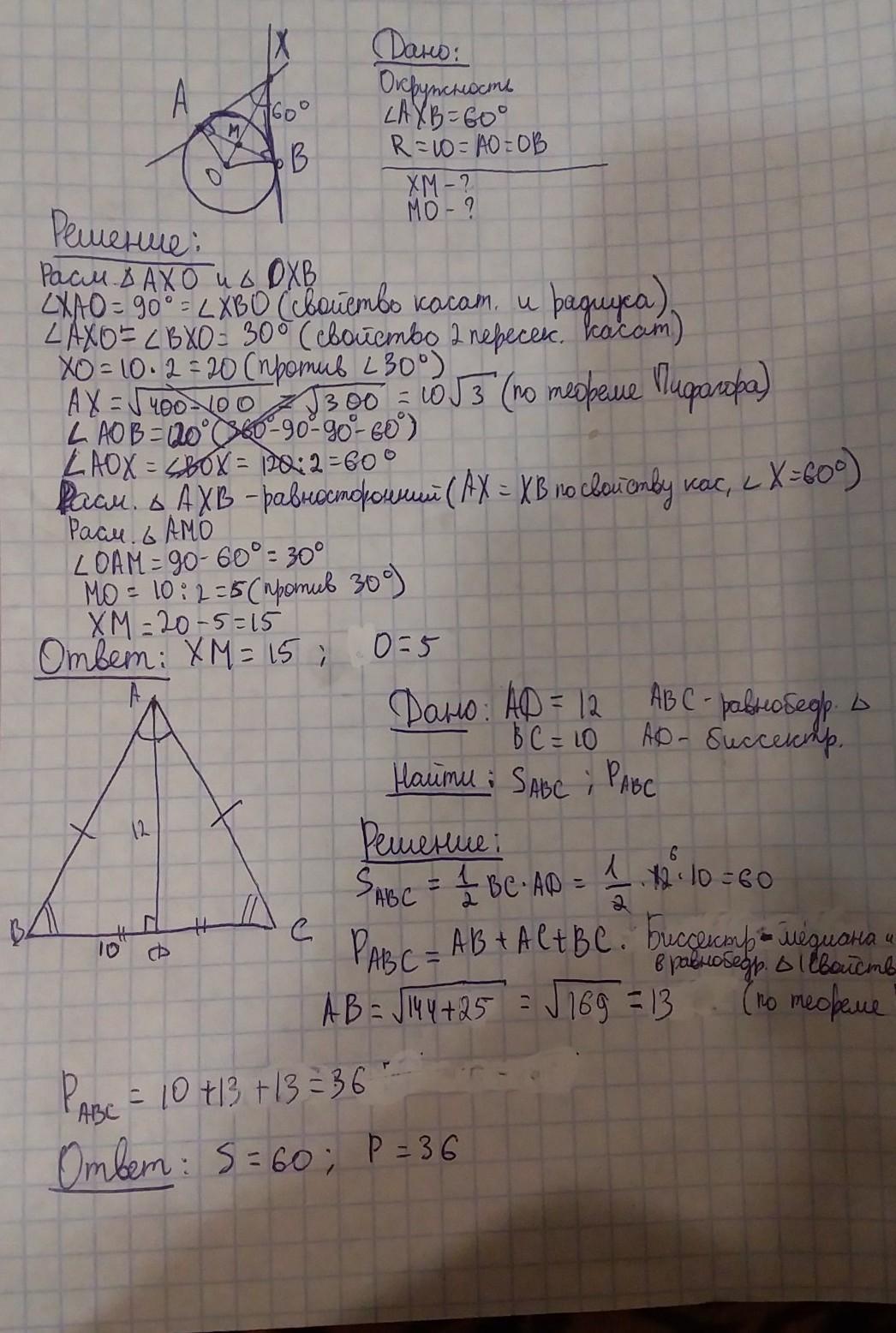 11. Отрезки касательных ХА и ХВ, проведенных к окружности с центром О радиуса 10, образуют ∠AXB = 60° . Найдите длины ХМ и МО, если М – точка пересечения ХО и АВ.