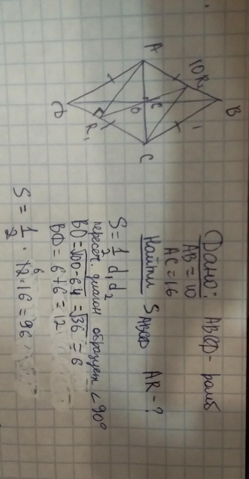 13. Вычислите площадь ромба и расстояние между его параллельными сторонами, если сторона ромба равна 10 см, а одна из его диагоналей равна 16 см.