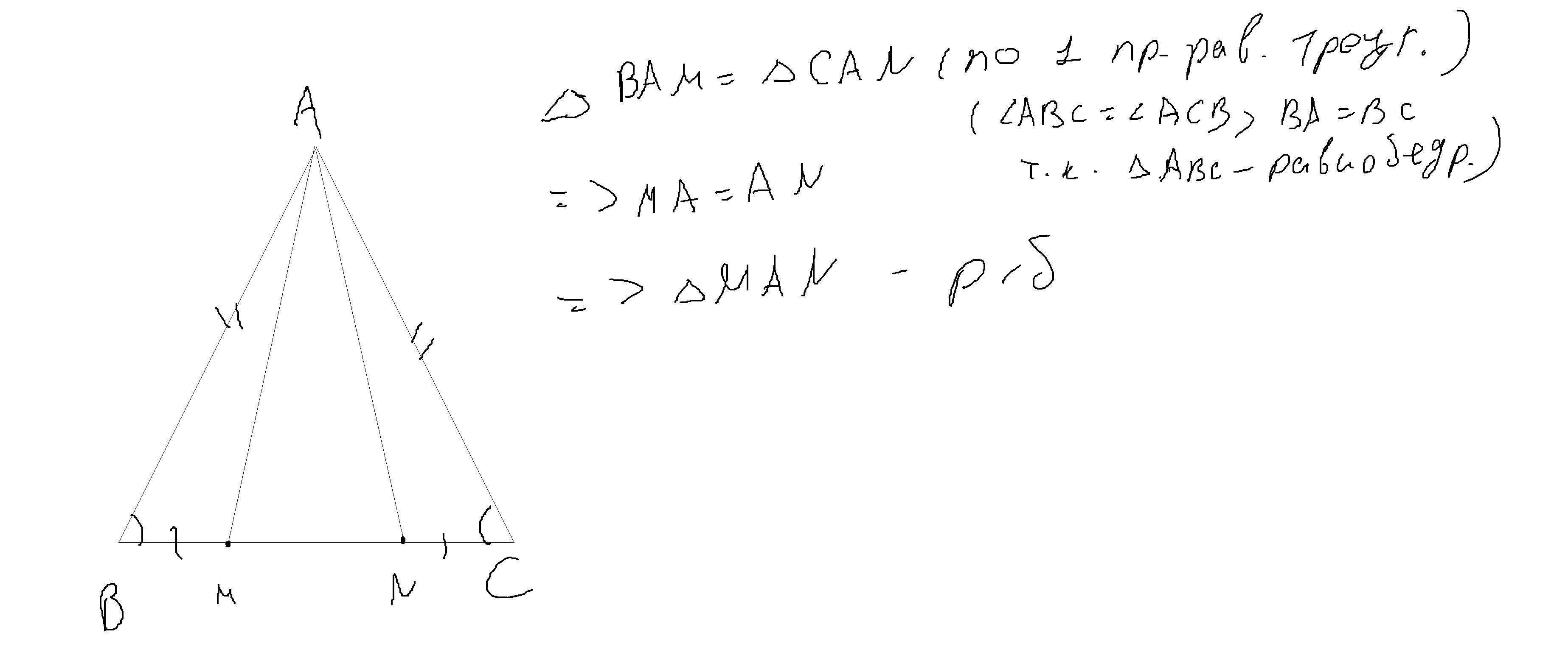 Т.к. МВ=СN по условию, а АВ=АС, пототму что треугольник равнобедренный, то угол АВМ=АСN при основании равнобедренного, значит треугольник , поэтому треугольники АВМ=треугольнику АСN по друм сторонам и углу между ними. А так как треугольники равны, то треугольник АМN - равнобедренный