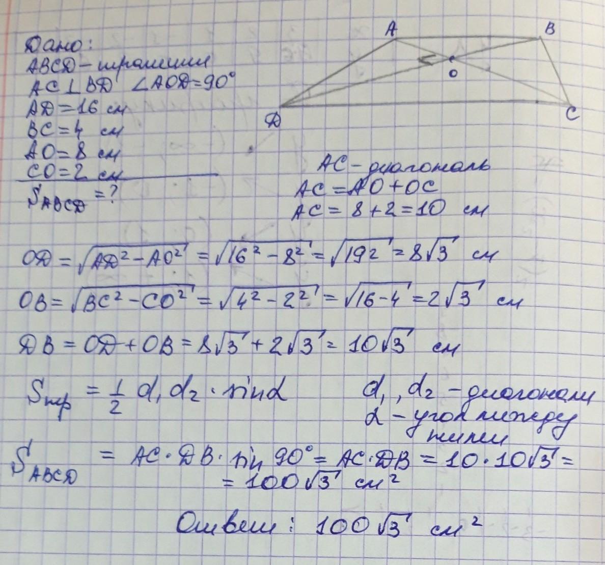 Ребят, очень срочно, пожалуйста, помогите. Abcd - трапеция. Ac перпендикулярно BD. BC=4 см AD=16 см AO=8 см CO=2 см. Найти площадь трапеции.
