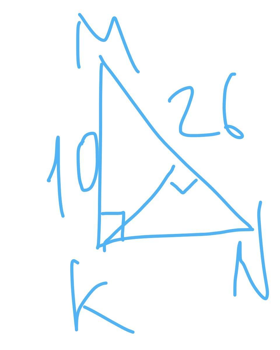 В треугольнике KMN <К=90°, МК=10, МN=26. Из вершины прямого угла проведена высота KH. Найдите неизвестные элементы треугольника. Помогитеее пж срочно надо