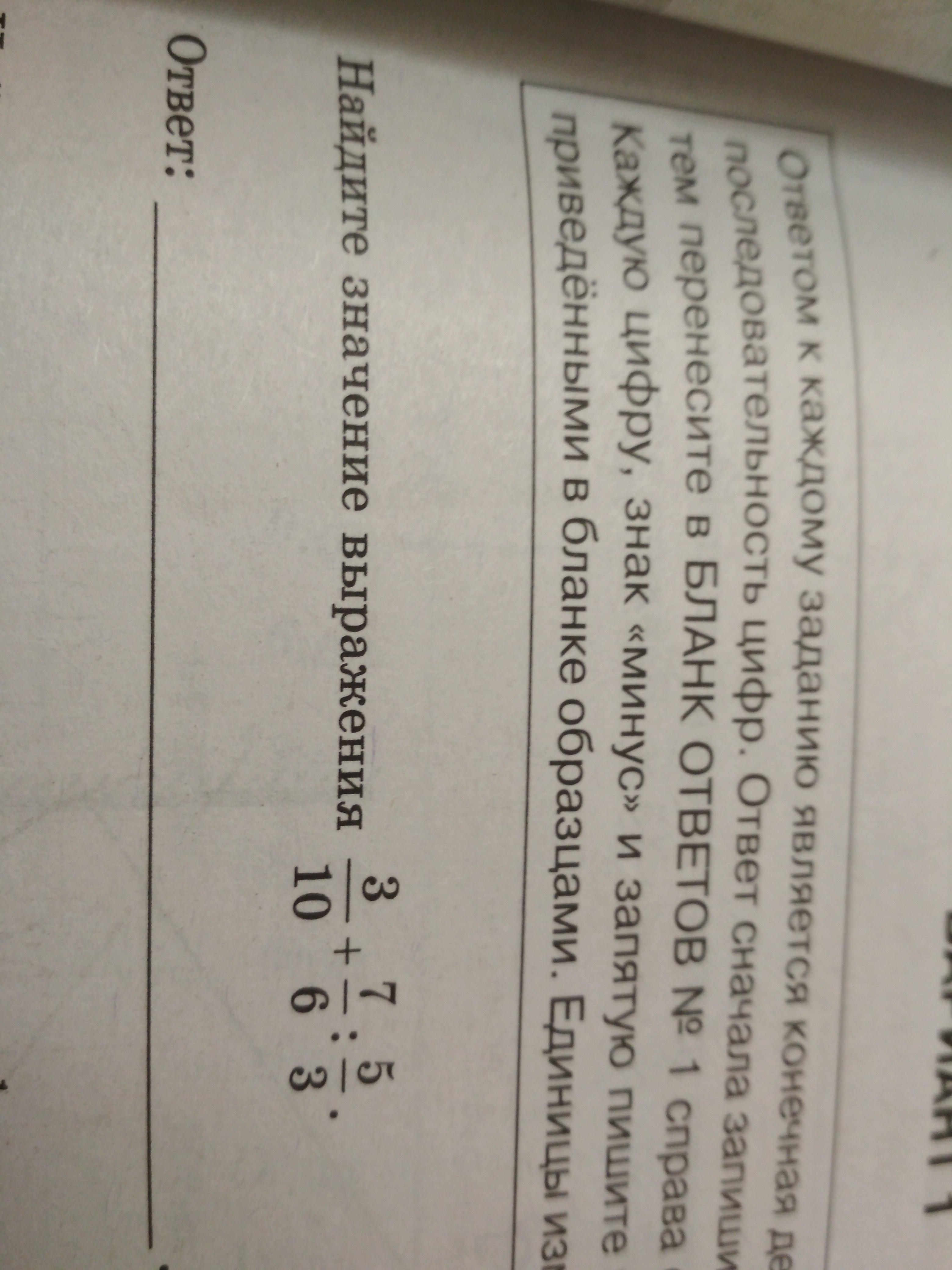 3/10+7/6:5/3=3/10+7/6*3/5=3/10+7/2*1/5=3/10+7/10=0.3+0.7=1