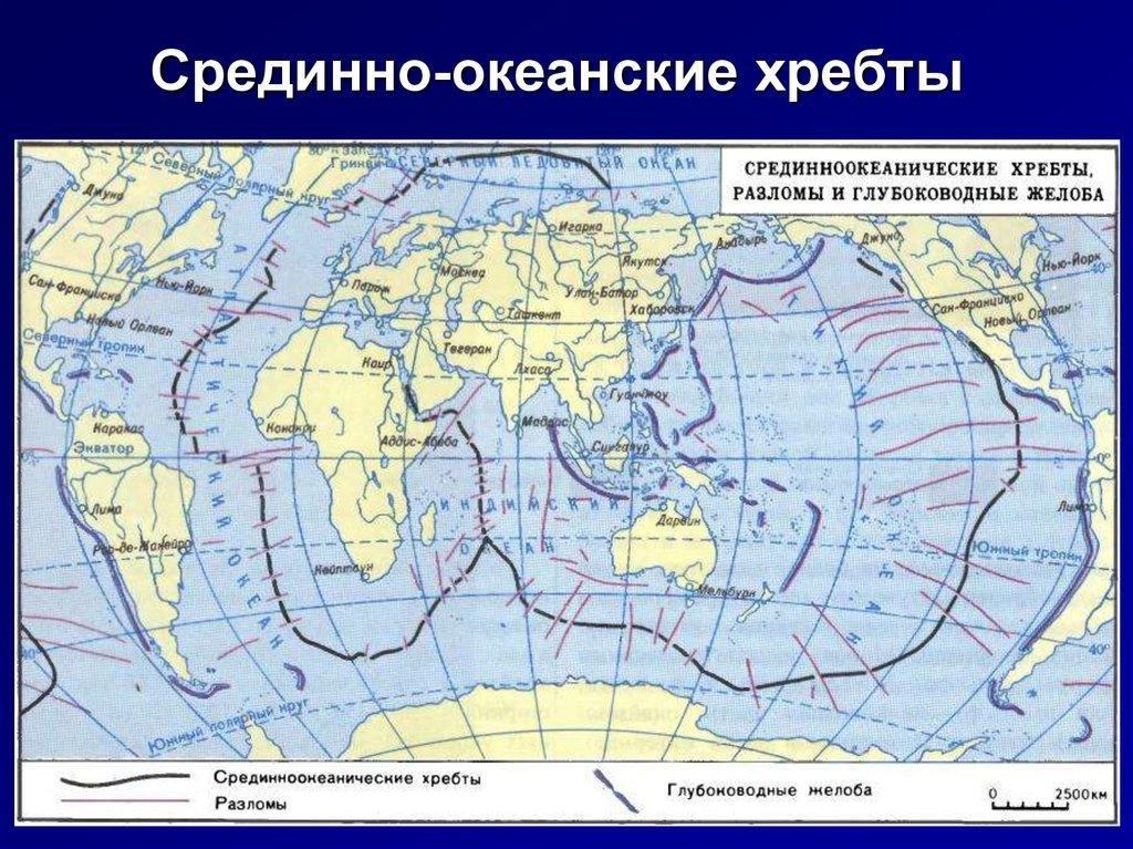 Крупнейшие структуры океанов, связанные с глобальными глубинными разломами. В их центральной части протягивается зона узких рифтовых долин, рассеченных поперечными разломами. Рассматриваются сегодняшней наукой как зоны зарождения земной коры и её последующего разрастания.