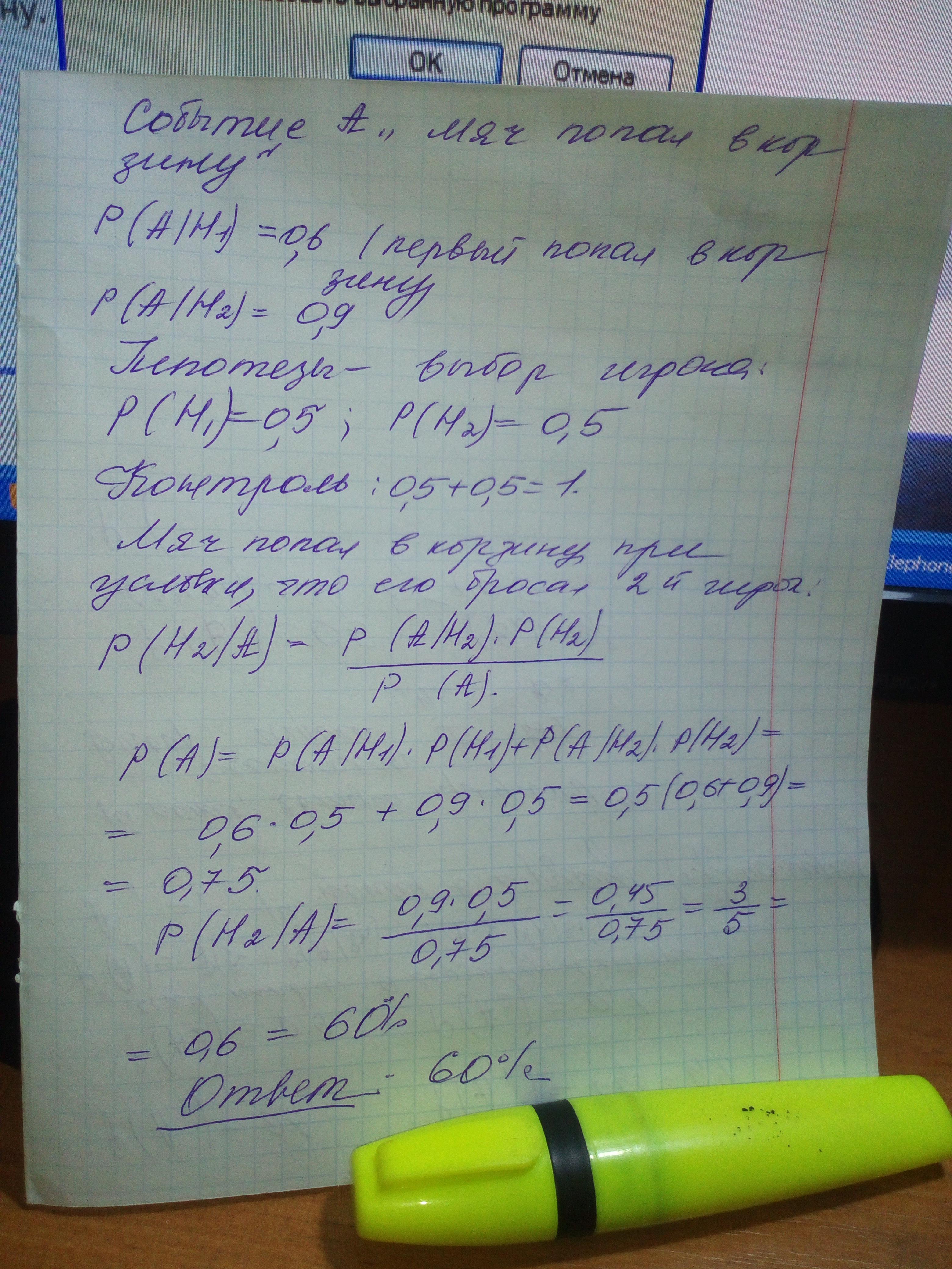 Из двух баскетболистов наугад выбирают одного, и он бросает мяч в корзину. Вероятность попадания в корзину для первого игрока равна 0.6 , для второго – 0,9. Найдите вероятность того, что был выбран второй игрок, если известно, что мяч попал в корзину.
