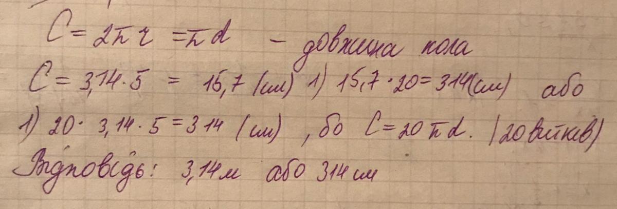 Довжина дроту=20πd=100×3.14=314см