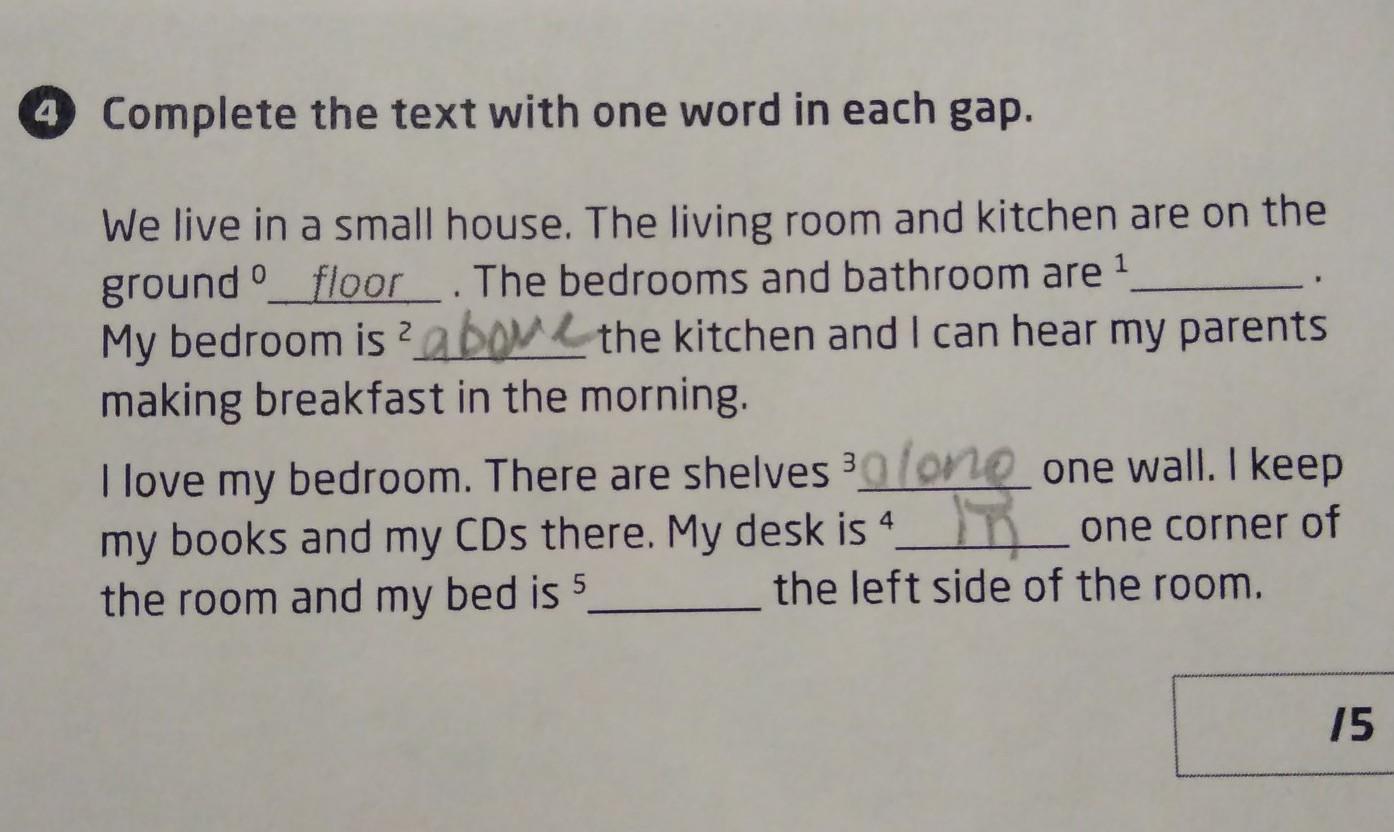 We live in a small house. The living room and kitchen are on the ground floor. The bedrooms and bathroom are upstairs. My bedroom is above the kitchen and I can hear my parents making breakfast in the morning.